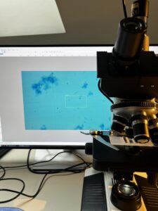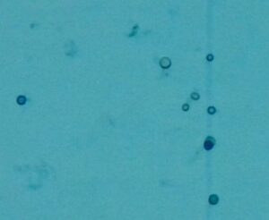 Mikroskop powinien mieć powiększenie x400 (okular 10 x obiektyw 40). Wygodnie, jeśli jest wyposażony w kamerkę – nawet taka najprostsza (~1MP) jest w zupełności wystarczająca. Dzięki temu można wygodnie liczyć drożdże na ekranie komputera, a nawet skreślać sobie te, które już są policzone.