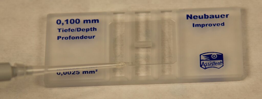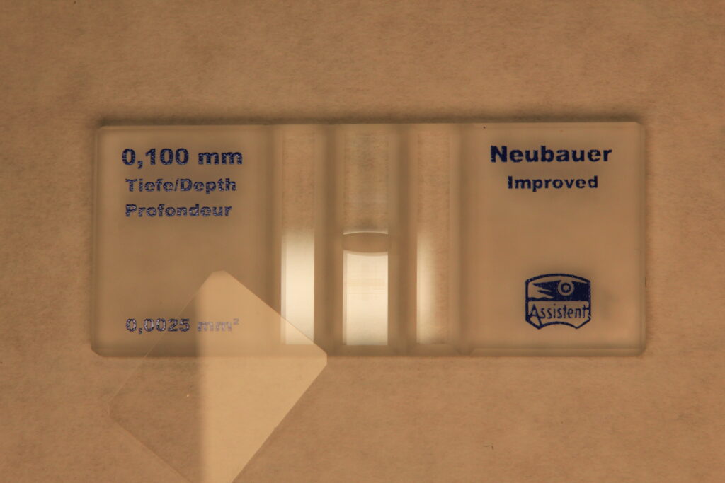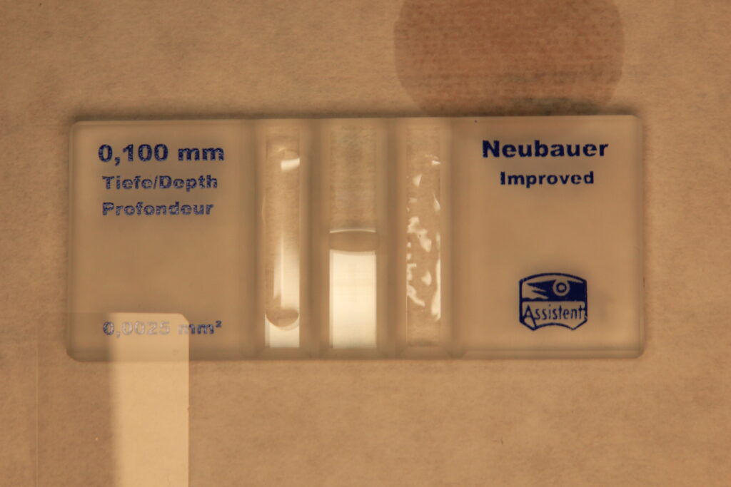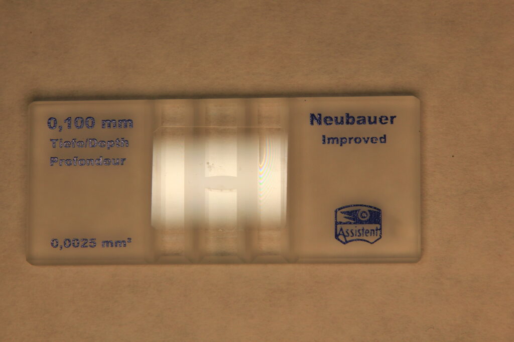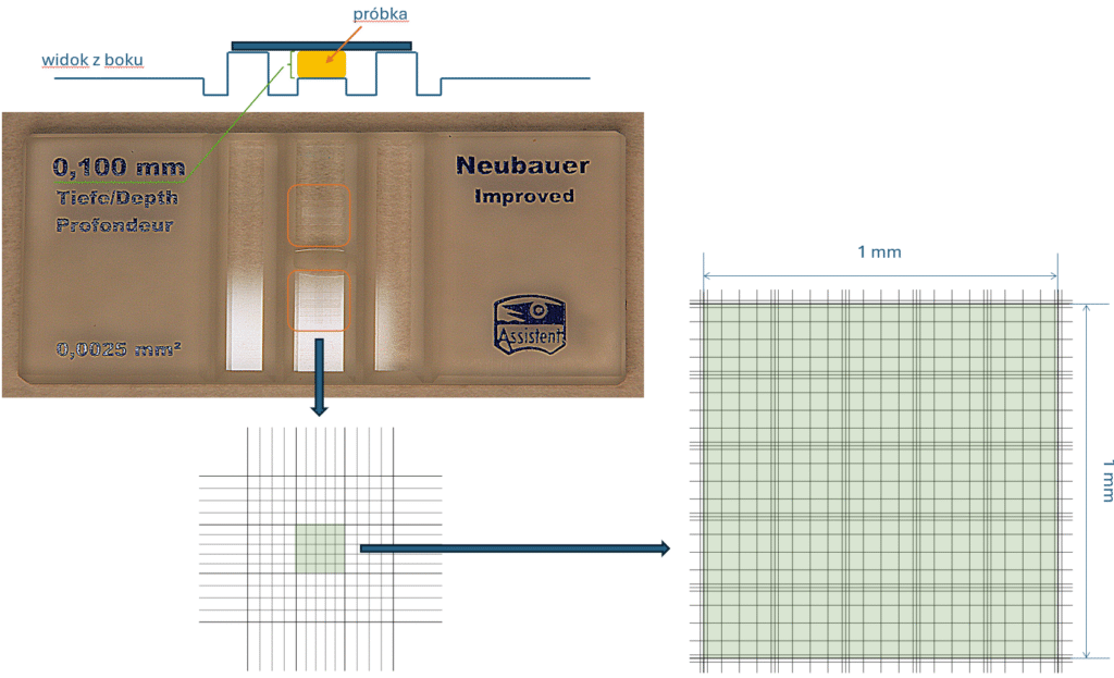 Mikroskop jak mikroskop. Najważniejsza jest specjalna płytka. Płytka ma wygrawerowaną szczegółową mikro-podziałkę, która ułatwia liczenie – ale co najważniejsze: ma precyzyjnie zdefiniowaną objętość badanej próbki, dzięki czemu wynik można przeliczyć na 1 mL.