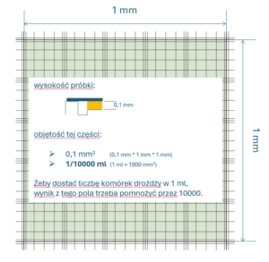 Objętość próbki znajdującej się na obszarze zielonego polu jest mikroskopijna, więc żeby przestawić wynik w przeliczeniu na 1 mL, liczbę zauważonych drożdży trzeba przemnożyć przez 10.000. Ten mnożnik bierze się stąd:
