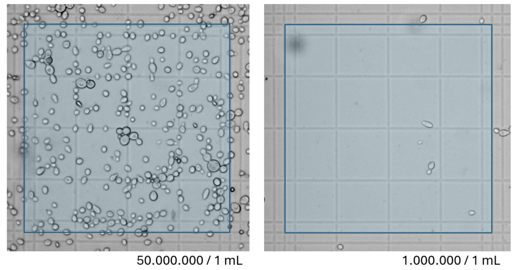 Minimalna liczba drożdży, jaką można zmierzyć taką płytką, to 10.000 komórek / 1 mL. Odpowiada to znalezieniu dokładnie 1 sztuki drożdża na całym zielonym polu. W takim przypadku można rozejrzeć się jeszcze po pozostałych ośmiu sąsiadujących polach, żeby upewnić się czy i tam drożdży jest równie mało.