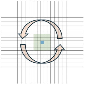 Drożdże zlicza się na środkowym polu, które powyżej zaznaczyłem na zielono. To pole składa się z 25 mniejszych pól (na niebiesko), które ogląda się używając powiększenia x400 i po kolei sumuje zauważone komórki. Potrójne linie służą łatwiejszej orientacji na obrazie.